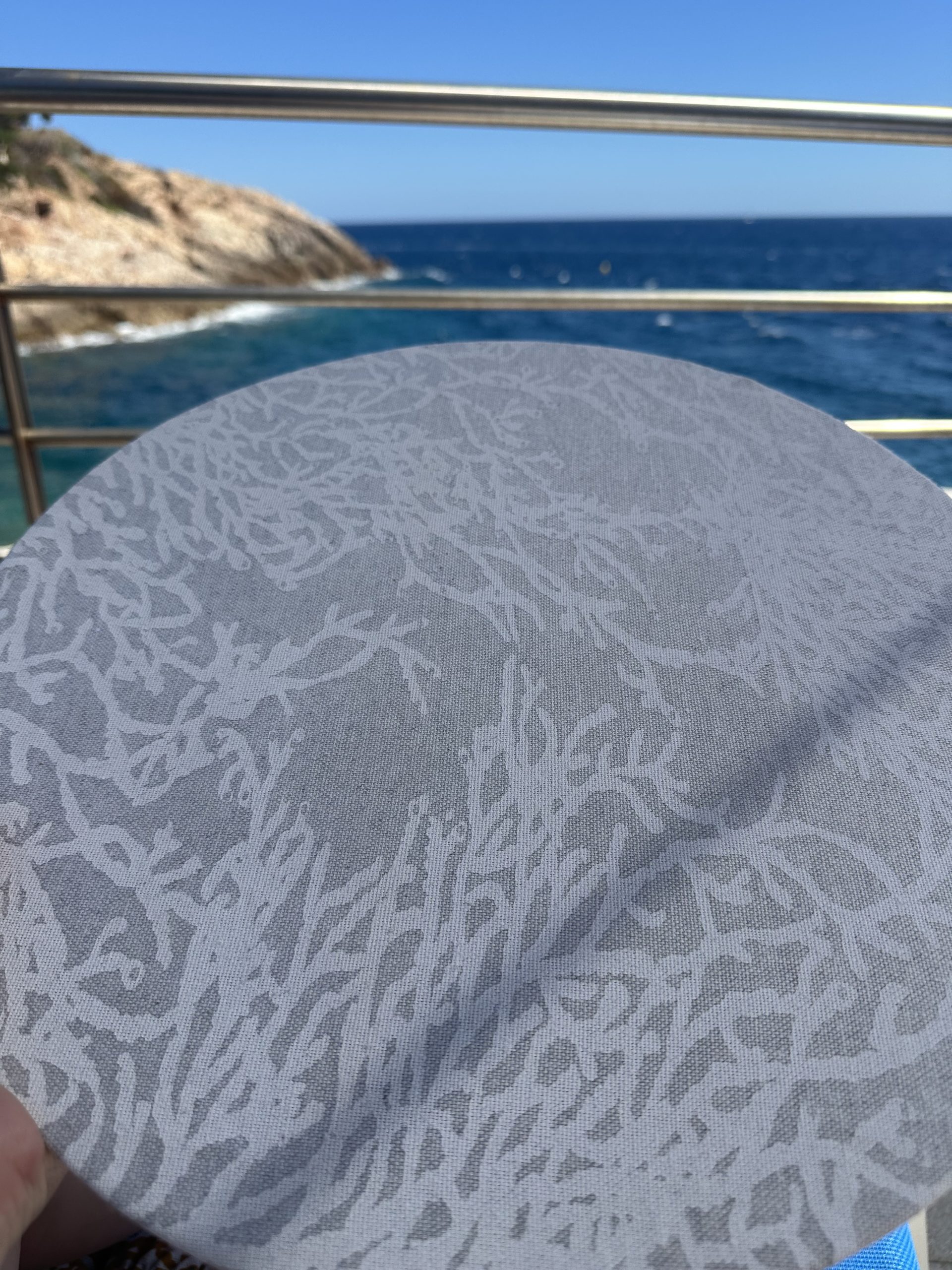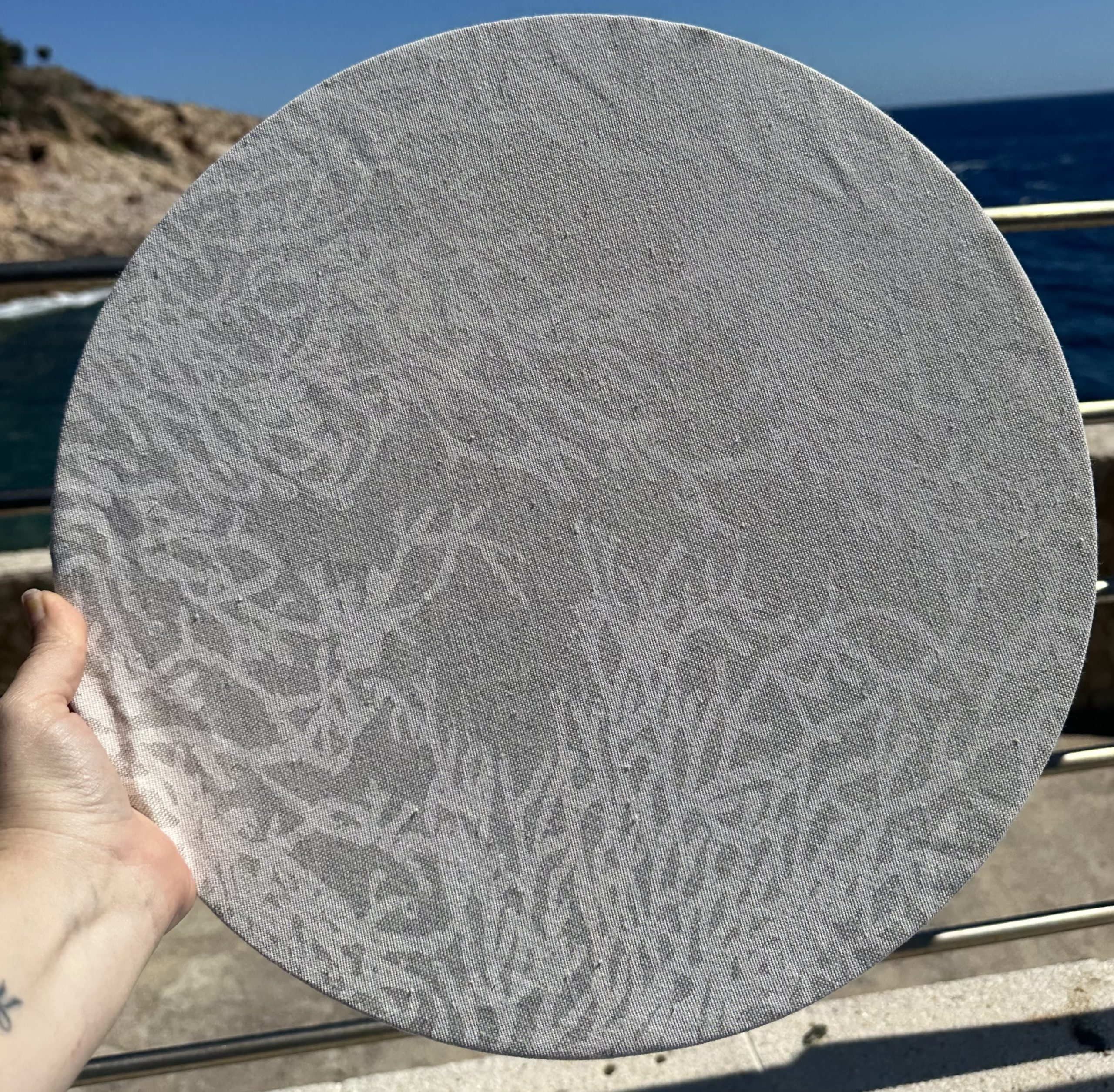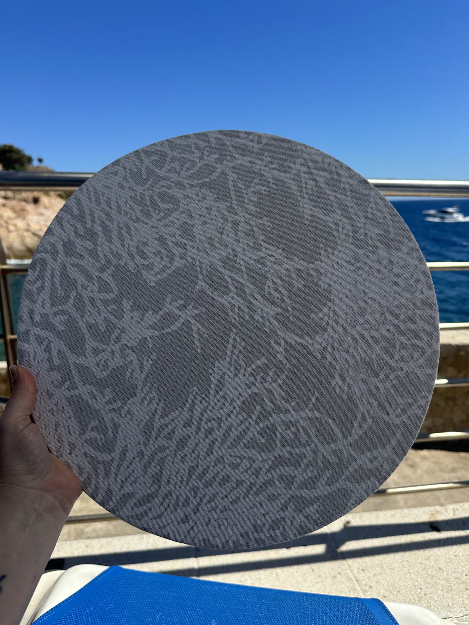 Set de table rigides, il s’agit d’un disque de MDF de 3mm d’épaisseur et d’un diamètre de 39 cm avec une face laquée blanche, recouvert d’une housse en tissus.